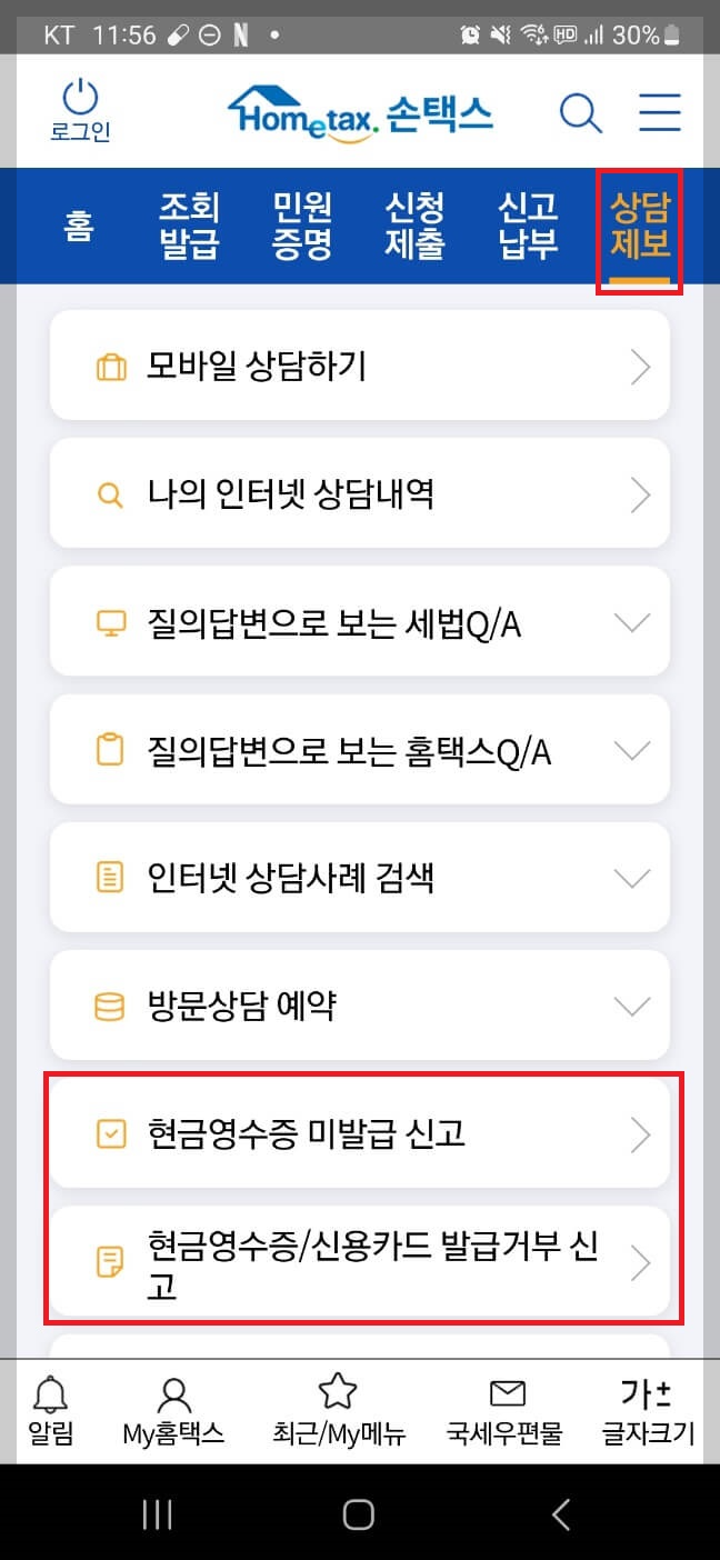 손택스 앱에 접속 후 '상담/제보' - '현금영수증 미발급/발급거부 신고' 를 선택하여 신고를 진행하세요